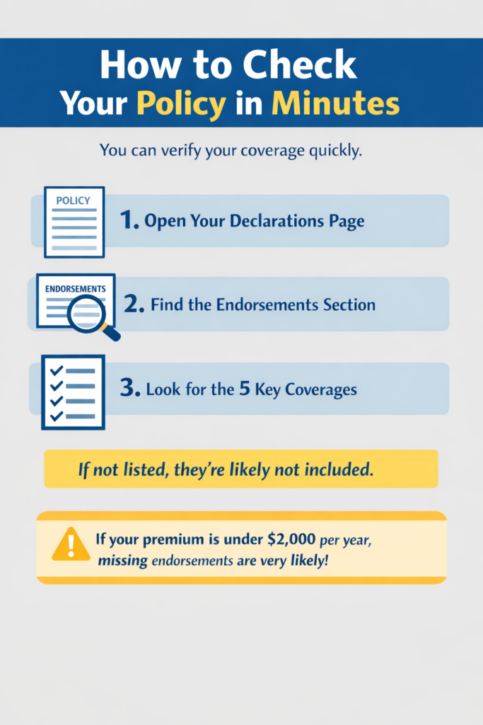 Now you know the five most commonly missing endorsements, what they cost, and how they impact real world claims. The next step is simple. Make sure your coverage matches your risk.