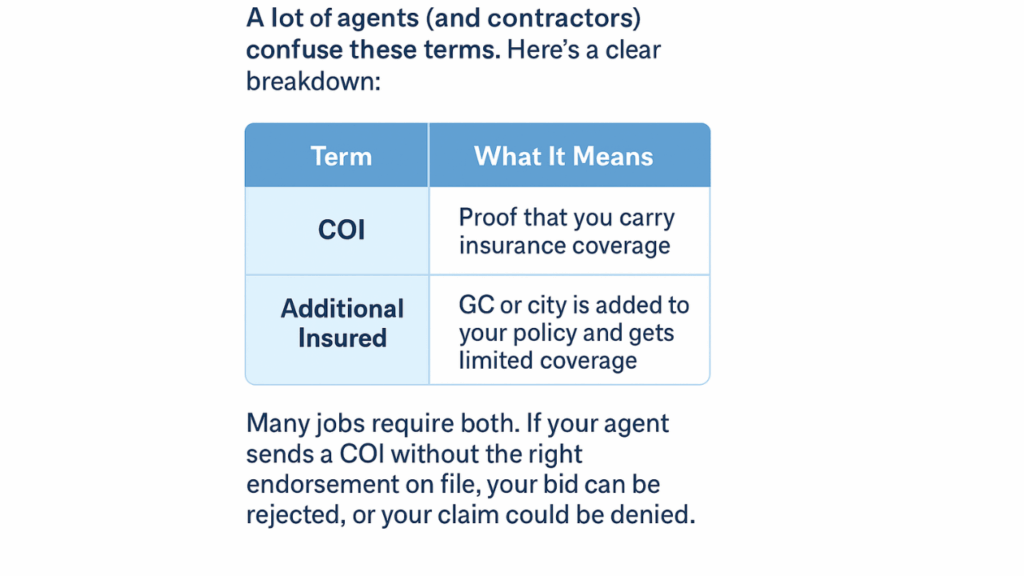 Sarah, an electrical contractor in Plano, landed a $60,000 commercial job. The GC asked for a Certificate of Insurance with Additional Insured language. Her agent said, “I’ll try to get it out this week.”